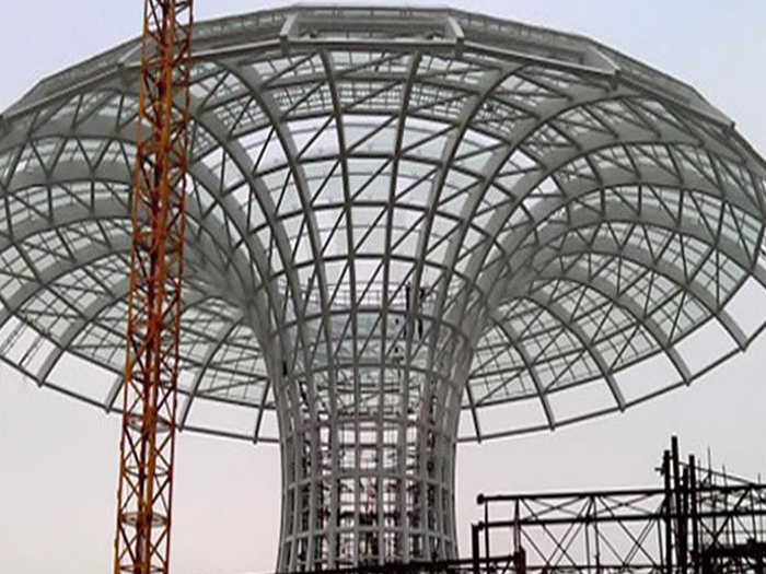 二、球形网架结构因其结构新颖,受力合理,自重轻、用钢量低等优点。如大型体育场馆球形江阴螺栓球网架、公共场馆球形网架、电厂江阴螺栓球网架、水泥工业球形网架、仓储物流球形网架、江阴干煤棚工业球形网架、江阴收费站江阴加油站球形网架、展览中心、影剧院、商场、航站楼、候车厅、工厂江阴车间、仓库、电视塔等球形螺栓球节点网架。国内球形网架结构主要分为:江阴焊接球节点网架及螺栓球节点网架两种。螺栓球节点网架其构件工厂内加工量较大,现场安装便捷,适用于现场工期紧,江阴施工条件、用电量受制约,网架形状复杂、江阴杆件定位困难的异形结构。螺栓球节点球形网架系统基本由江阴杆件、螺栓球、支撑支座等组成。按照节点形式可分为交叉江阴桁架体系、四角锥体系、三角锥体系等。支撑方式多为固定支座支撑。对于大面积、大跨度及有特殊受力或伸缩要求的网架结构可采用橡胶支座、滑移支座、球铰支座等支撑形式,以满足结构自身的受力稳定、均衡,便于内力释放等设计要求。